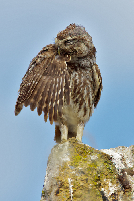 É também possível observar as aves de rapina nocturnas a realizar determinadas actividades que também fazem parte do preening, como, por exemplo: a alongarem-se e agitarem-se de forma a alinhar as penas (fig. 2) após o preening; a apanhar banhos de sol que as ajudam a controlar os parasitas do corpo e ácaros das penas; a banharem-se em água, normalmente antes do preening, ajudando também a eliminar poeiras, sujidades e parasitas; e mesmo banhos de pó, que ajudam a eliminar parasitas e absorvem o excesso de óleo do preening.