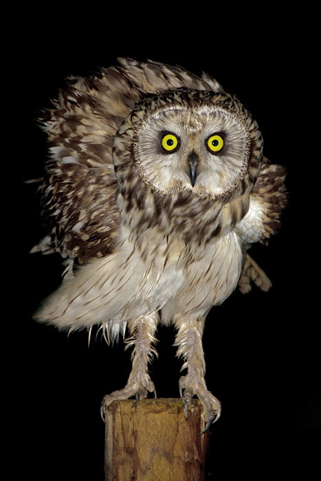 As aves de rapina nocturnas possuem um voo extremamente silencioso. Isto deve-se a três características especiais da sua plumagem: bordo exterior das penas de voo serrilhado, franja no bordo interior das penas de voo e superfície das asas e corpo aveludadas. Estas características têm, como principal função, suprimir o ruído que poderia ser provocado pelo voo.